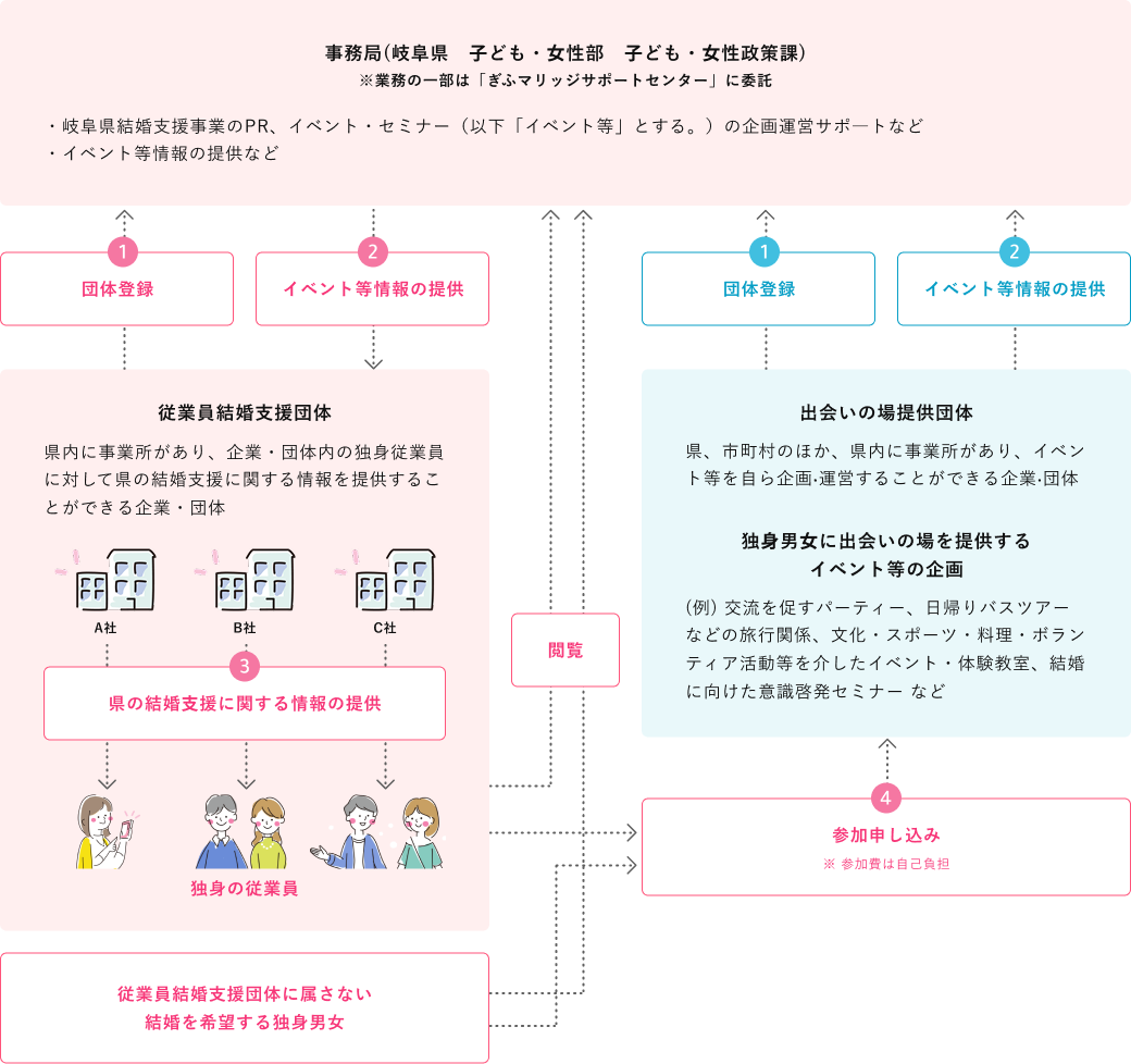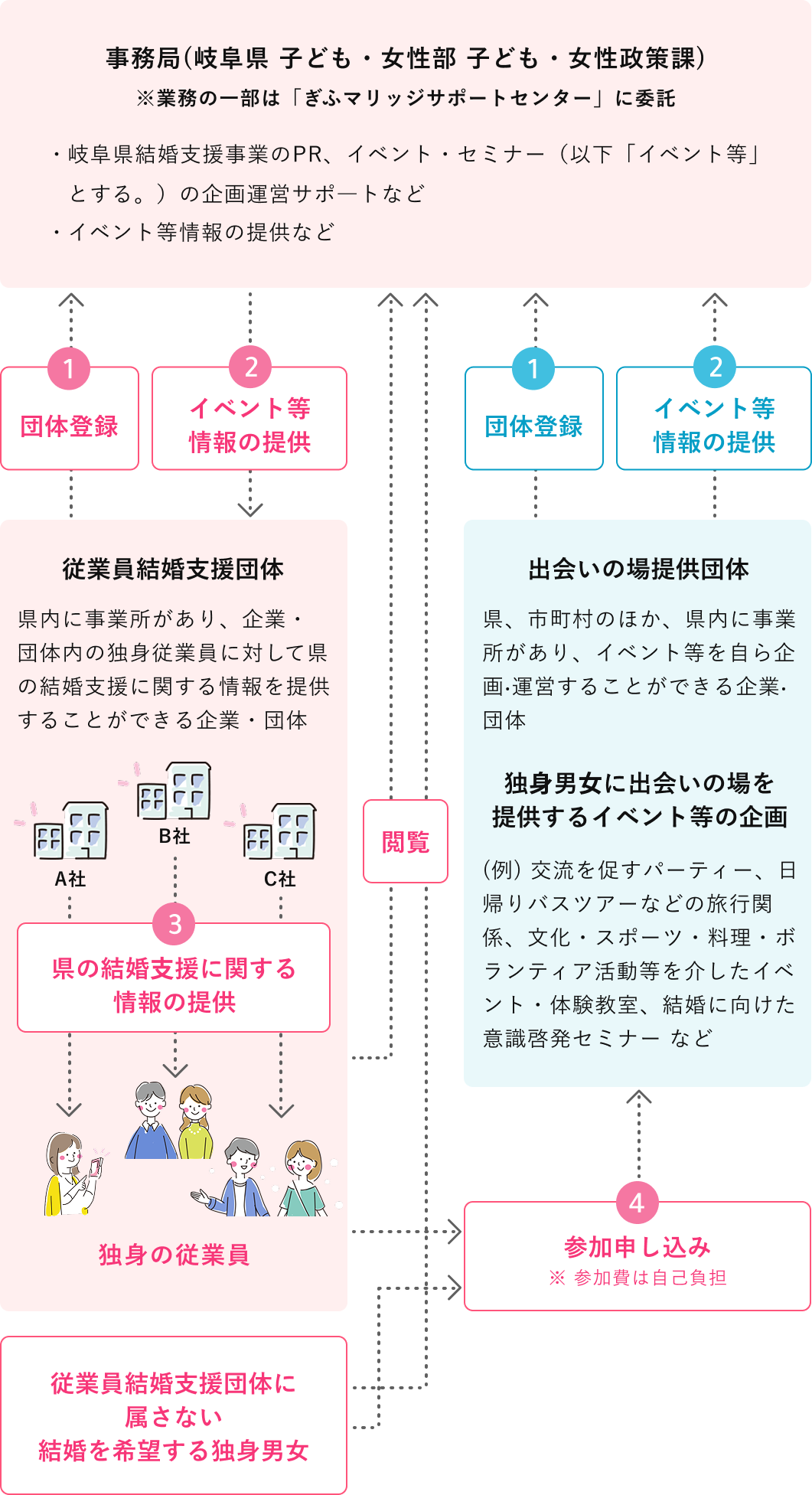 県では、少子化の要因の一つとなっている晩婚化・非婚化傾向の改善に向けて、結婚を考えながらも出会いの機会が少ない独身男女に対して、県内の企業・団体や市町村と協力・連携して出会いの場を提供する「ぎふ婚活サポートプロジェクト」を実施します。